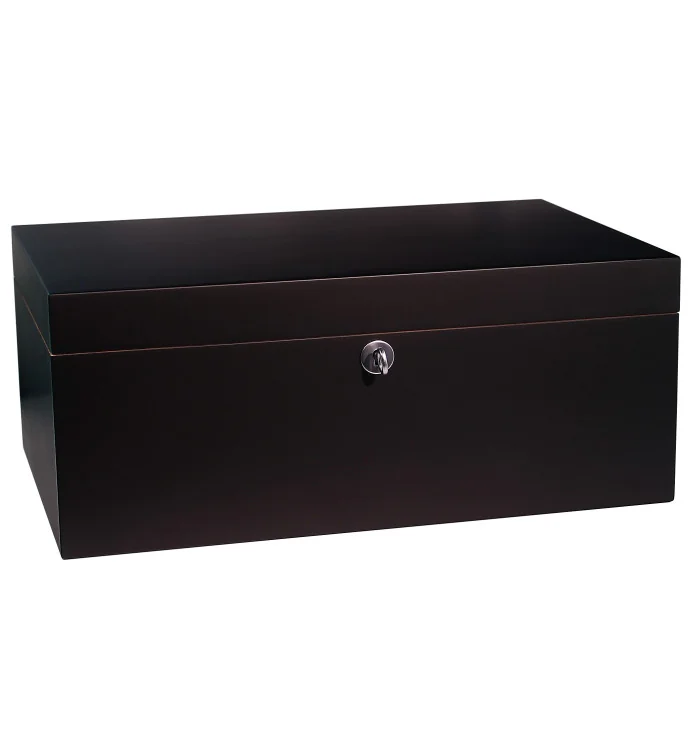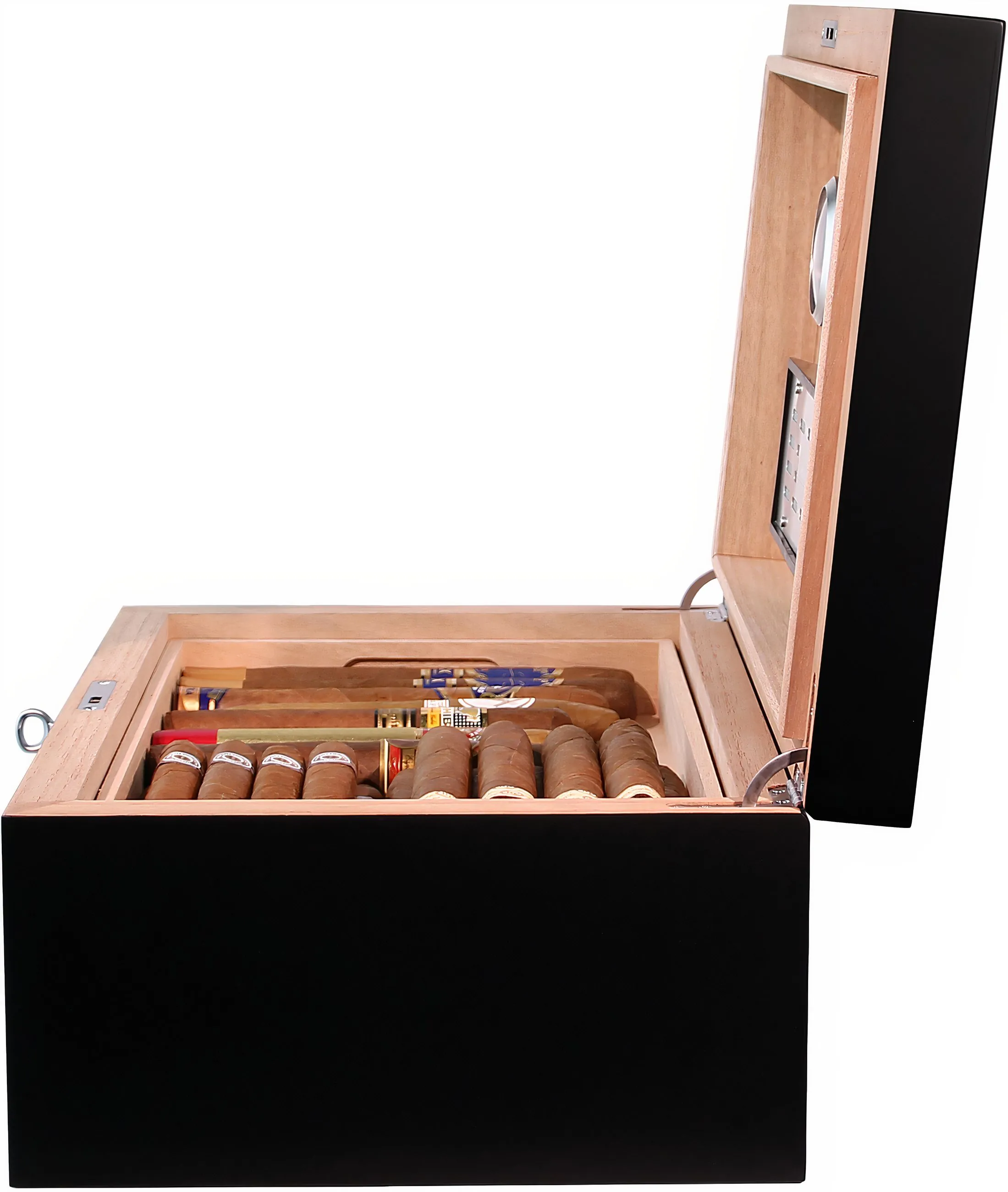 adorini Humidor Black Basic L Denne moderne og funksjonelle humidoren fra Basic-serien til adorini i størrelse L imponerer med sin matte sorte finish og allsidighet. Med plass til ca. 150 sigarer eller enda mindre sigarbokser, er den en ideell løsning for trygg oppbevaring av sigarene dine. Det leveres med et analogt hygrometer og en passiv luftfukter med svamp. Hygrometeret måler luftfuktigheten ved hjelp av en metallspole, og er sammen med luftfukteren festet magnetisk og fleksibelt til lokket på humidoren. Humidoren er også utstyrt med en lås for å beskytte mot uautorisert tilgang. Et dobbelt sett med nøkler følger med, slik at du har en ekstranøkkel. Humidoren har innvendige hengsler i matt sølv og en spesielt sterk tetningsleppe som sørger for optimal fuktighetsbevaring. En vertikal skillevegg gjør det mulig å dele inn interiøret i flere rom. Et ekstra, avtakbart stativ i flere nivåer organiserer humidoren på en estetisk og funksjonell måte. Det er avtakbart og utstyrt med ventilasjonsspor for optimal fuktsirkulasjon.