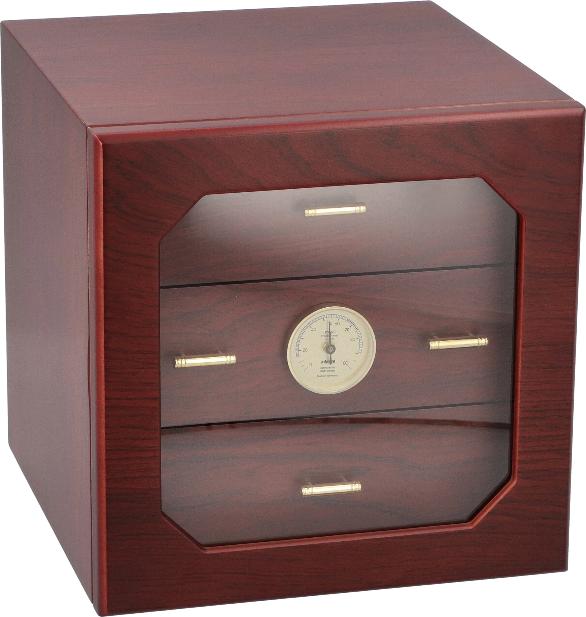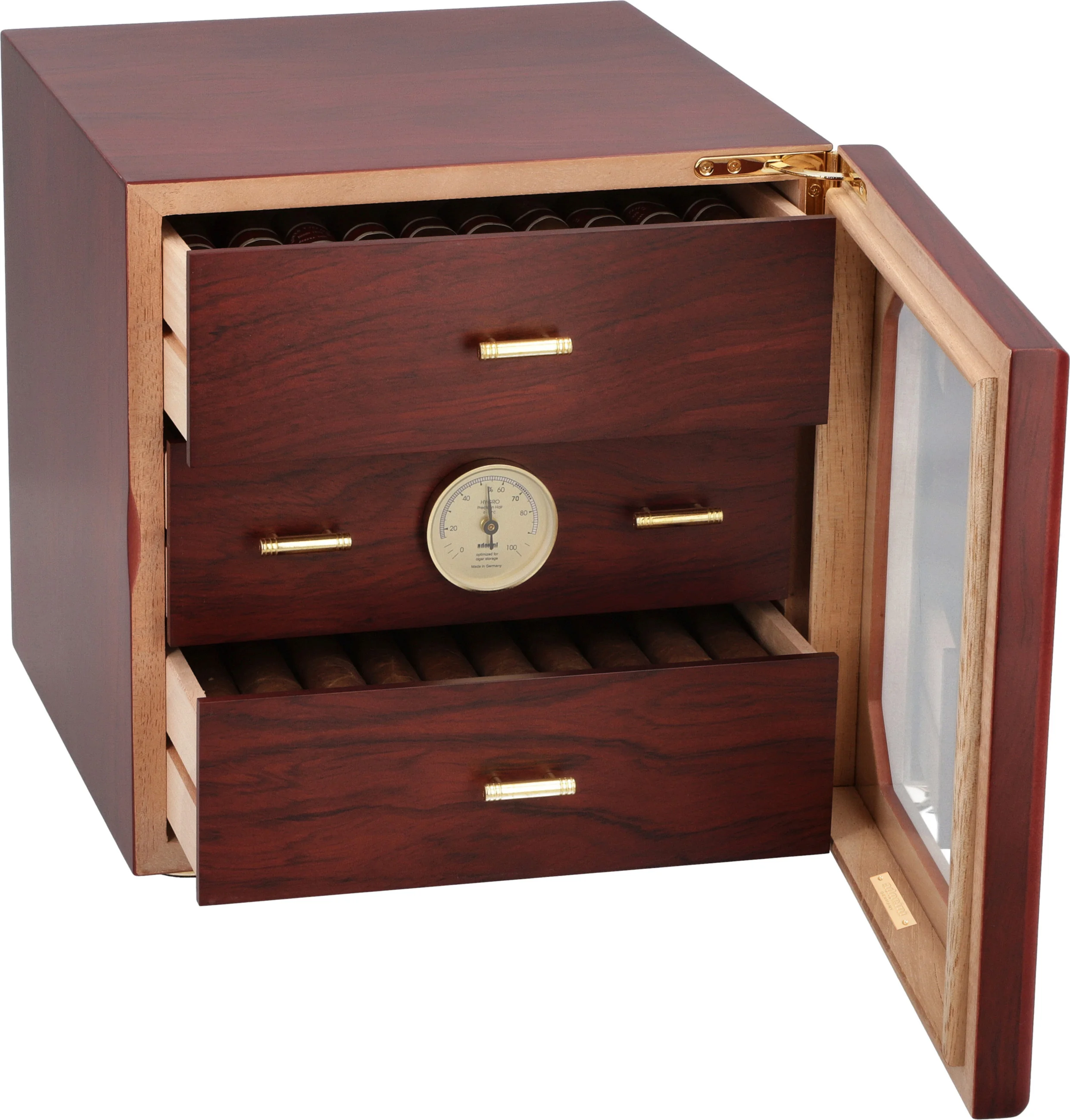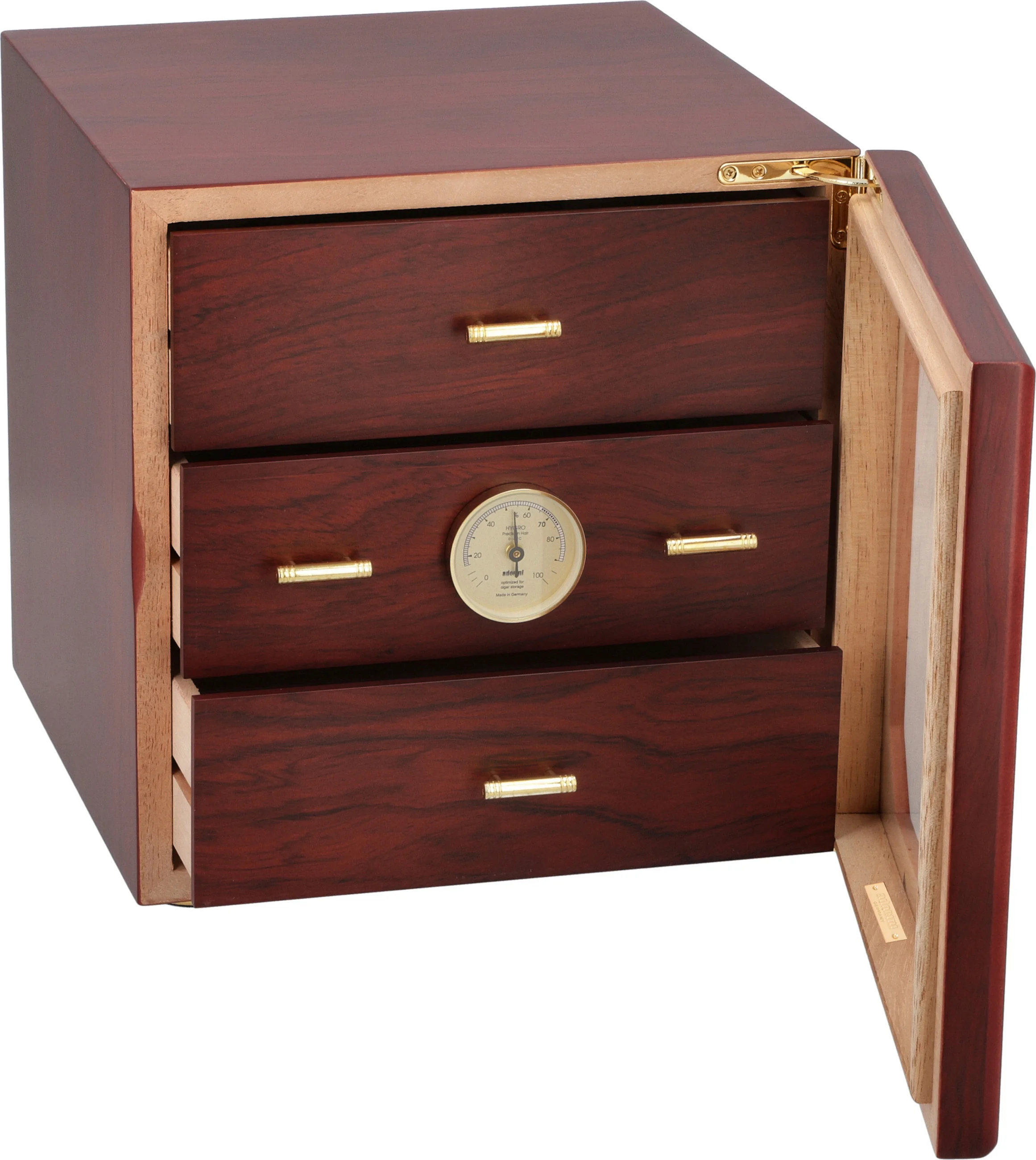 Humidoren vil romme over 125 standard Corona-størrelse sigarer, som holdes i optimal stand av adorinis deluxe gullbelagte akryl polymer-baserte befukter. Justerbare ventilasjonsåpninger lar deg avgrense fuktighetsnivået for å møte dine ønskede spesifikasjoner. Et forhåndskalibrert presisjonshårhygrometer er montert på forsiden av midtbrettet og krever bare en rask titt for å sjekke fuktighetsnivåene om humidoren er åpen eller lukket.