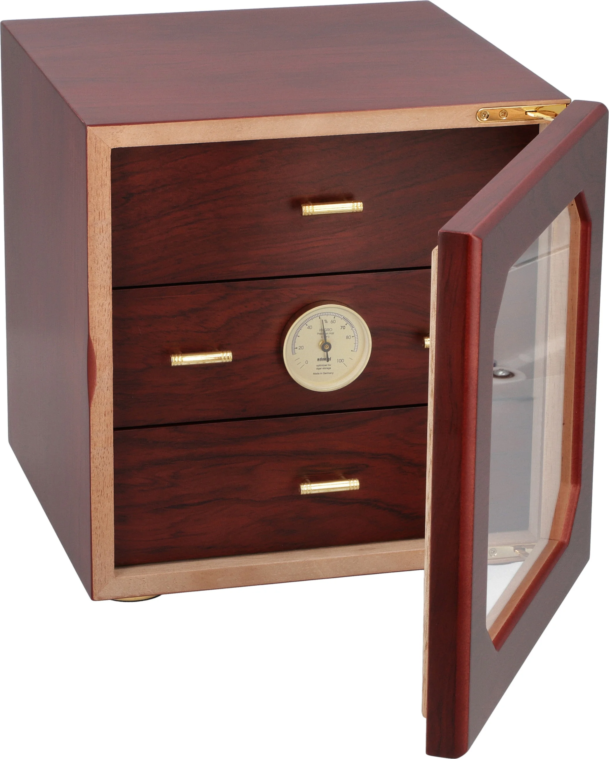 - Pre-kalibrert høy presisjon hårhygrometer, optimalisert for sigarlagring
