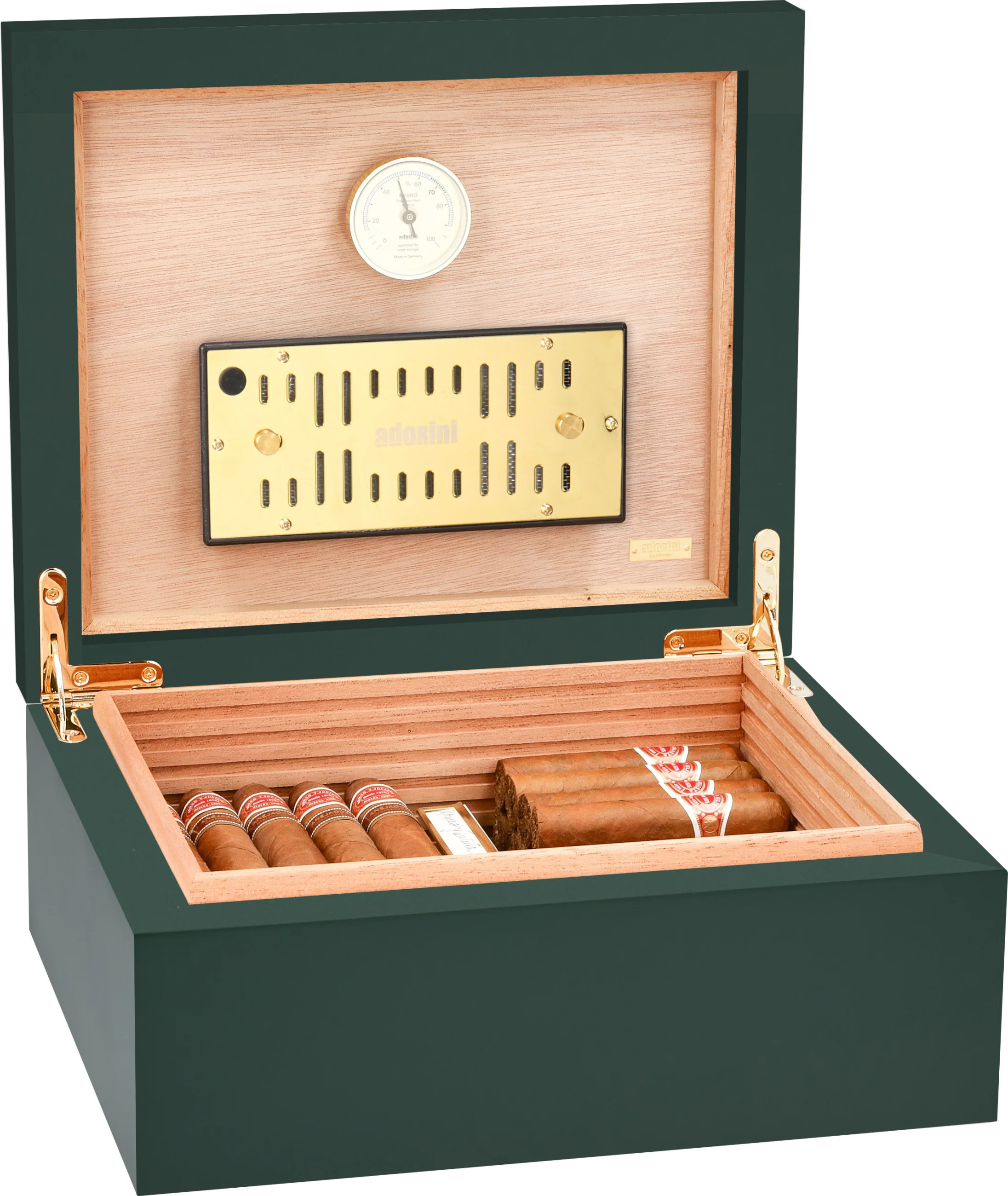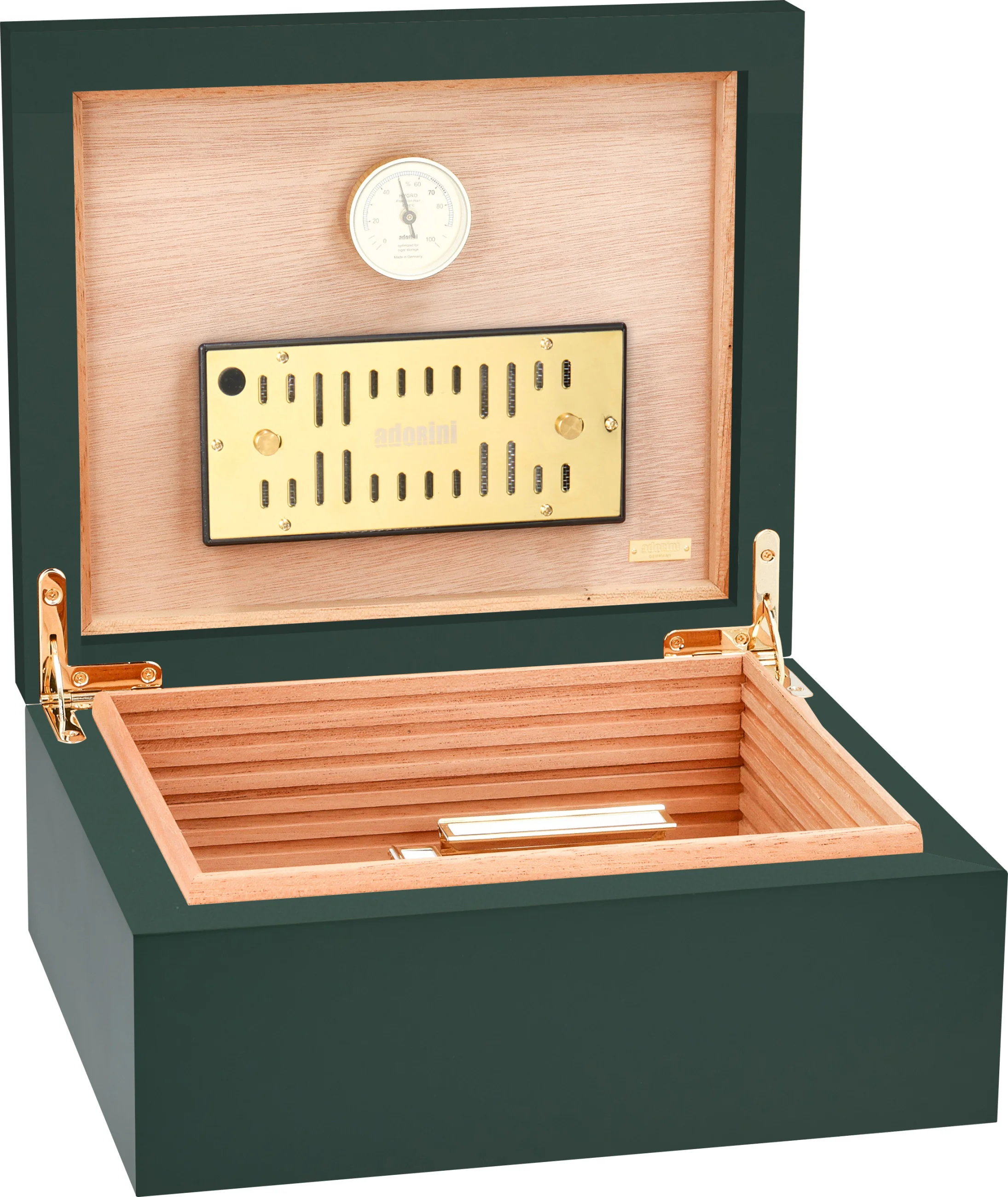 adorini Humidor Medium Deluxe Imperial Green er en del av den nye adorini-kolleksjonen i fire spennende fargevarianter. Denne modellen imponerer med en sofistikert, tidløs mørkegrønn farge, forsterket av gullelementer på innsiden. Spesielt bemerkelsesverdig er den mattgrønne soft-touch-finishen, som strekker seg utover ytterkanten og dermed også er synlig på innsiden. Dette gir humidoren en harmonisk og elegant helhetsvirkning.