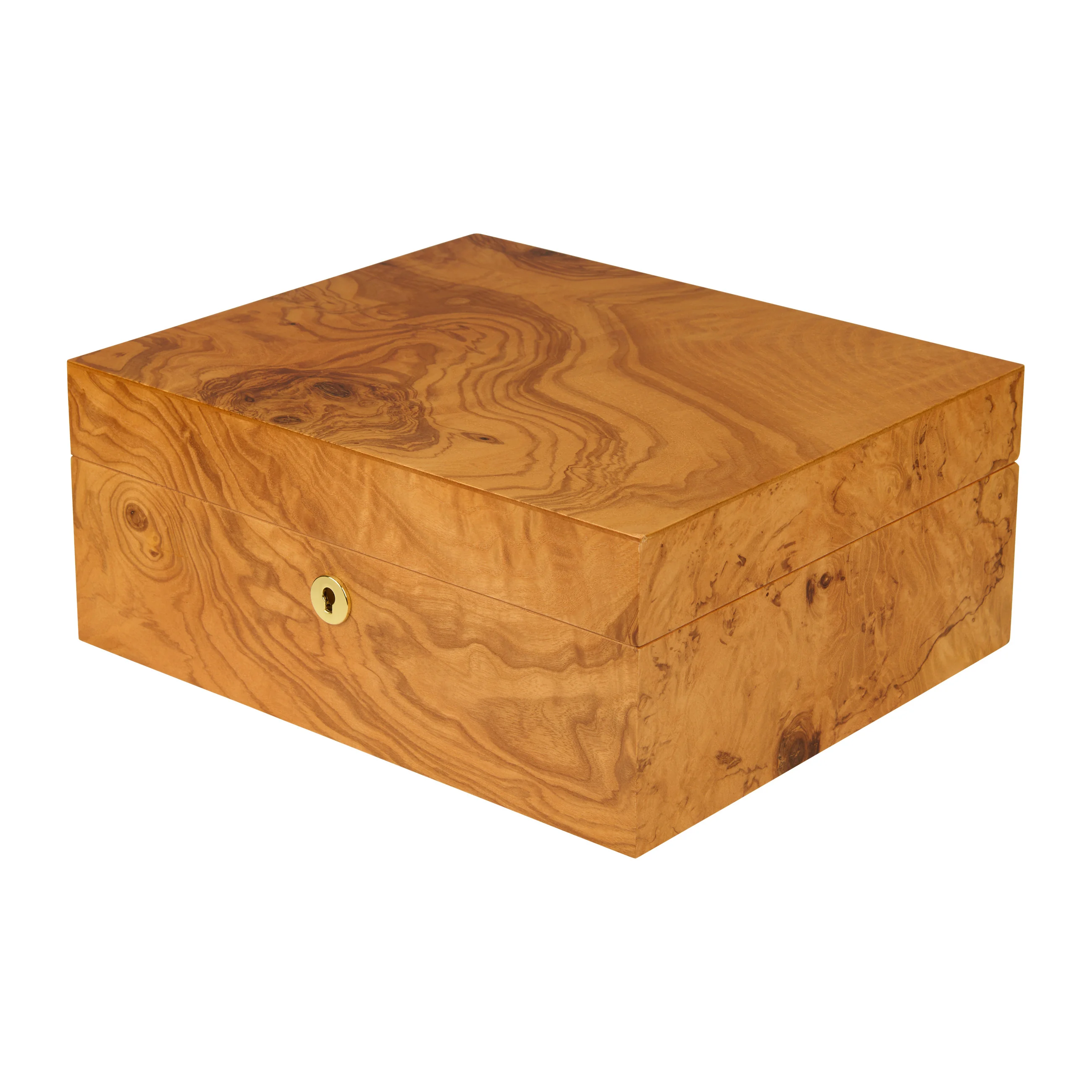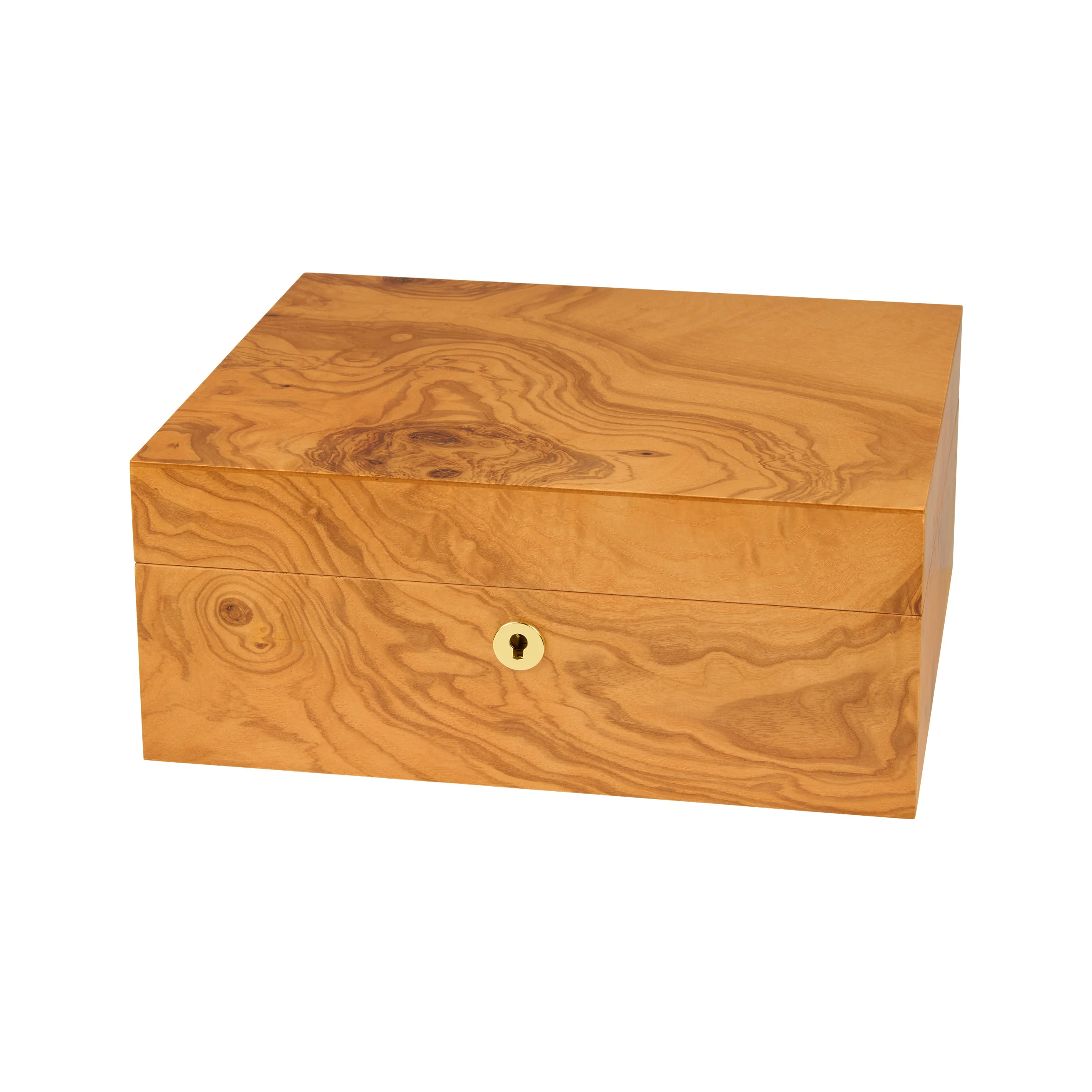 The olive wood impresses with its characteristic grain with honey-yellow to golden-brown tones, interspersed with dark, almost chocolate-colored veins. Thanks to its warm appearance, the humidor blends harmoniously into almost any setting. Medium-sized humidors hold up to 75 cigars, providing ample space for your cigar collection.