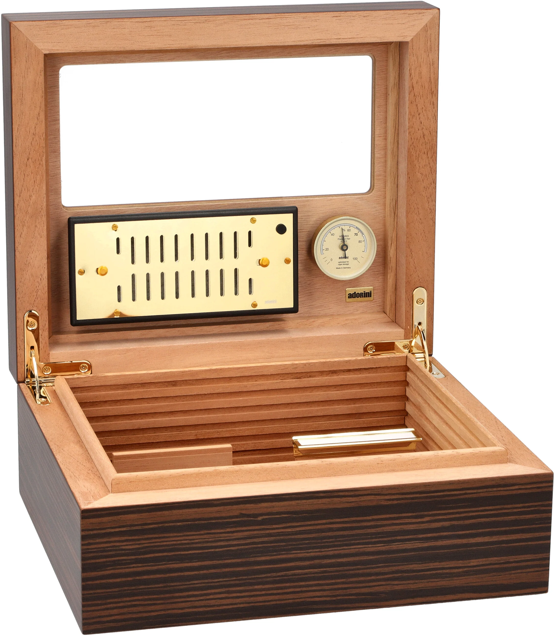 Vittoria humidor fra adorini er en ekte klassiker som nå er tilgjengelig i en vanlig bordhumidor størrelse. Med denne høykvalitets humidoren kan du oppbevare sigarene dine med stil og beskytte dem optimalt. Humidoren leveres komplett med et nøyaktig hårhygrometer og den eksklusive adorini deluxe luftfukteren. Befukteren kan brukes praktisk og plassbesparende i lokket på humidoren for å sikre konstant luftfuktighet.