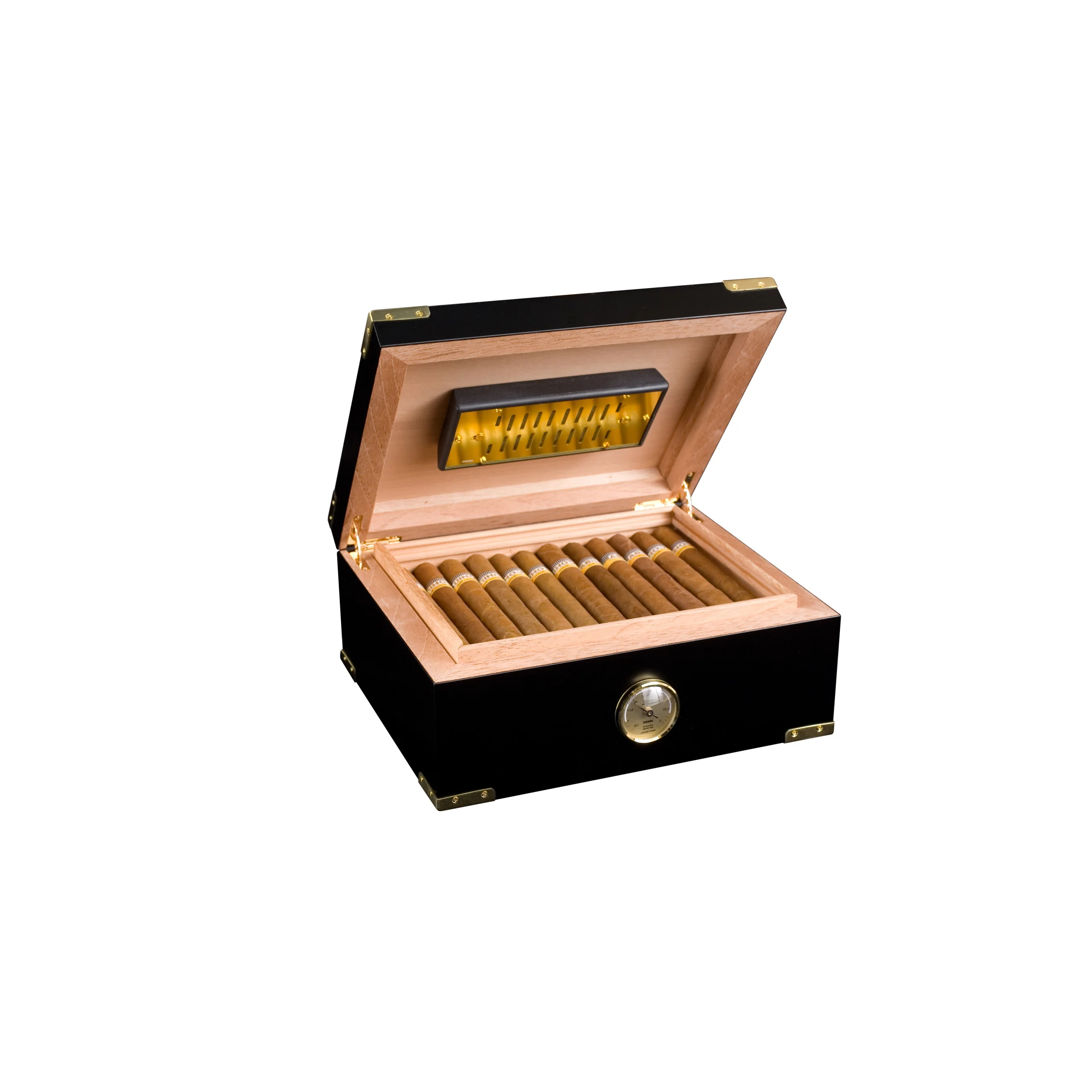 < /span>Denne humidoren minner om gamle skipskister, og vil la deg drømme om sjøreiser til fjerne steder, med sin klassiske svartlakkerte finish og gullbelagte hjørnebeskyttere< i messing span>. Et frontmontert presisjonspresist analogt hårhygrometer gir eksteriøret et ytterligere distingvert preg, mens en ekstra tykt kropp gir en solid og slitesterk konstruksjon. Kraftige 24K gullbelagte kvadranthengsler gir en jevn bevegelse når du åpner lokket for å avsløre et dampet interiør av spansk sedertre < span>med adorinis eksklusive RibTech ventilasjonsribber for forbedret luftsirkulasjon.