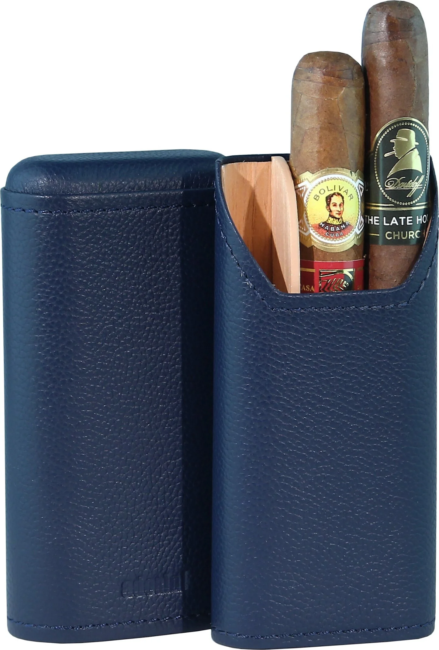 Stilig. Funksjonelt. Høy kvalitet. Adorinis sigaretui i blått, laget av ekte skinn, er den perfekte kombinasjonen av eleganse og beskyttelse for sigarene dine. Det har plass til 2-3 sigarer med en maksimal ringdiameter på 60 og kan justeres i lengden for å passe til ulike størrelser. Førsteklasses materialer for perfekt nytelse