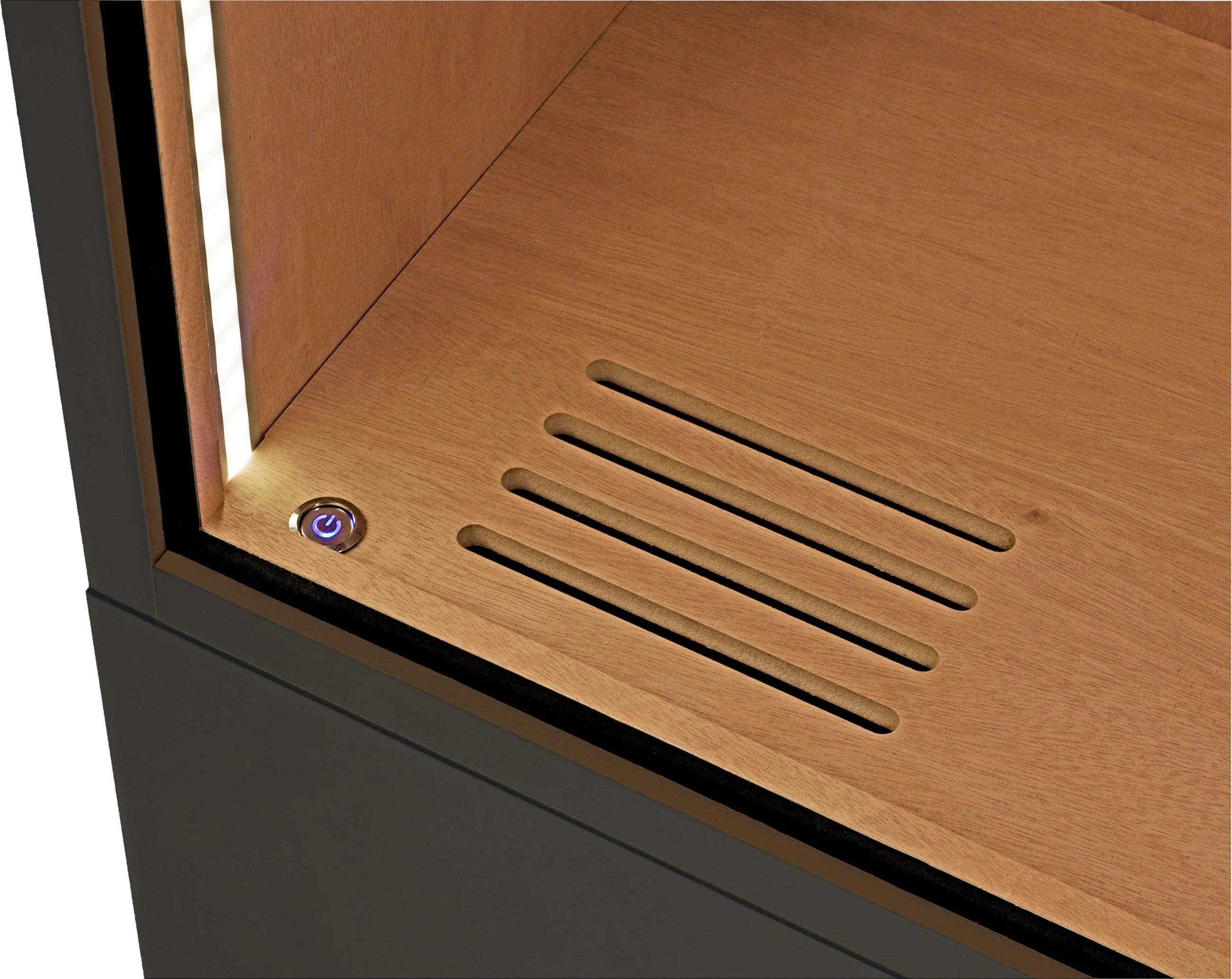- Perfekt mikroprosessorstyrt luftfukting og ideell sirkulasjon garantert av den doble bakveggen. Luftfuktigheten fordeles jevnt over de ulike etasjene i humidoren.