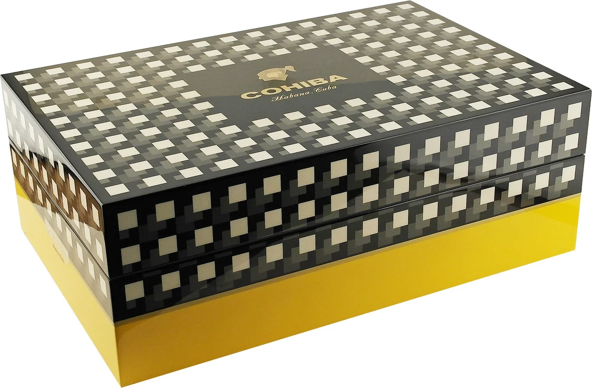 The humidor is presented in the unmistakable Cohiba colors of black, yellow, and white, which aficionados worldwide immediately associate with the brand. The Cohiba brand logo is prominently displayed on the lid. Upon opening, high-quality gold hinges are revealed, which are also embossed with the Cohiba name. Inside, there is a plaque indicating the individual limited edition number.