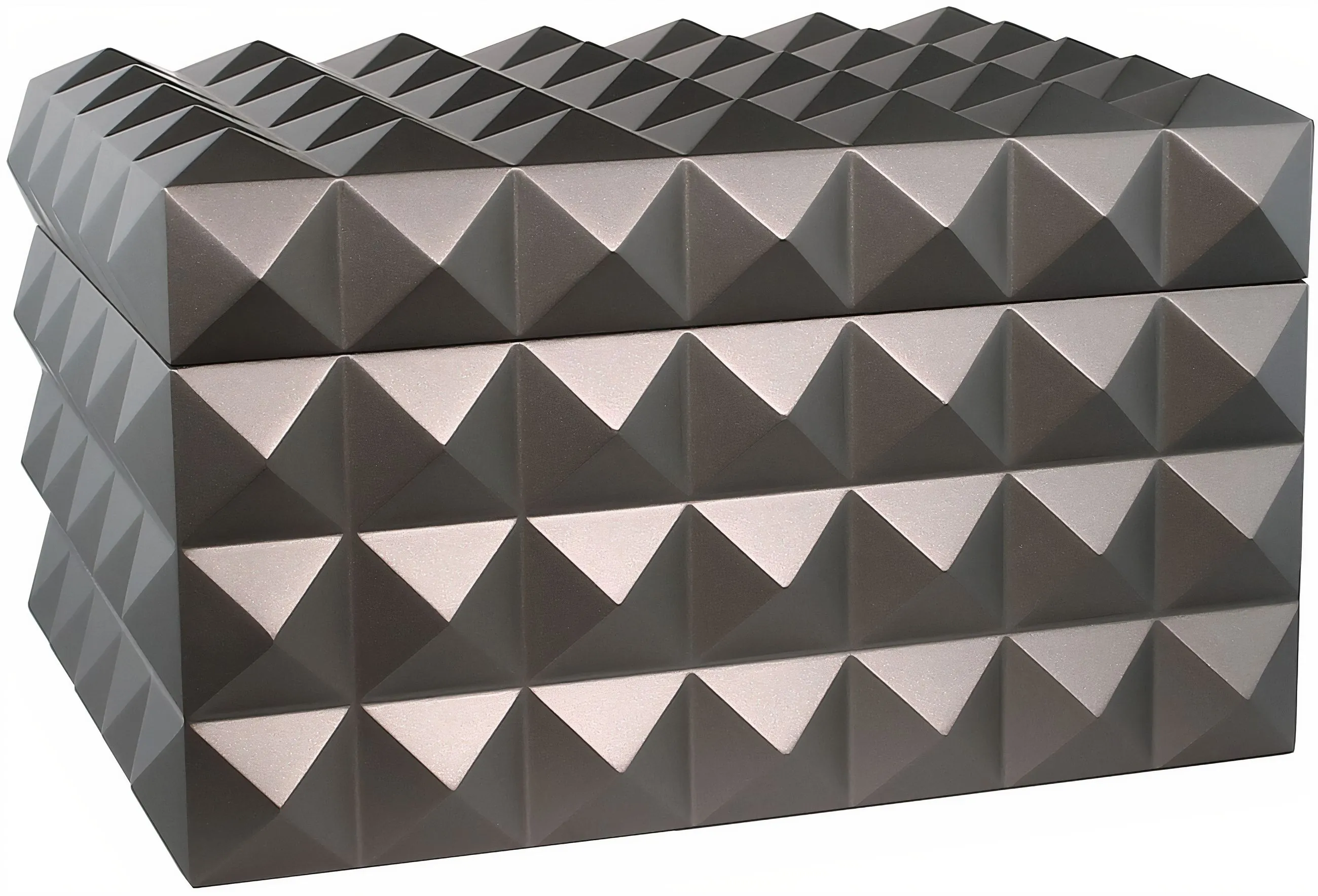 Colibri Humidor Grand Quasar grå Colibri Humidor Grand Quasar er en eksepsjonell humidor fra den anerkjente Quasar-serien. Den futuristiske, tredimensjonale designen med pyramideformede forhøyninger gjør den til et absolutt blikkfang og skiller den fra klassiske humidorer. Med sin unike stil kombinerer den innovasjon og eleganse og er derfor et høydepunkt for kresne sigarelskere. Humidoren har en estimert kapasitet på ca. 150-175 sigarer. Selv mindre sigarbokser får lett plass her. Interiøret er smart inndelt: Et avtakbart stativ med riller gjør det mulig å oppbevare individuelle sigarer, samtidig som det sørger for optimal luftsirkulasjon i det nedre området. Det har også en fleksibel vertikal skillevegg for bedre organisering. Den nedre delen har en fleksibel skillevegg, slik at lagringsplassen kan tilpasses. Leveransen inkluderer en passiv luftfukter og et digitalt hygrometer, som gjør det mulig å kontrollere luftfuktigheten nøyaktig. Det nødvendige batteriet er allerede inkludert. Gulvet i humidoren er dekket med myk fløyel for å beskytte møblene dine mot riper. Grand Quasar leveres i en emballasje av høy kvalitet, noe som også gjør den til en ideell gave. Tekniske detaljer:
