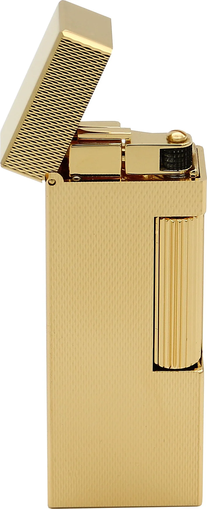 The combination of finely patterned surfaces on the front and back and highly polished, smooth sides gives the lighter its elegant, distinctive look. The Dunhill brand logo is finely engraved on one side. The ignition is protected from dust and dirt by a cover, which further increases the service life of the mechanism.