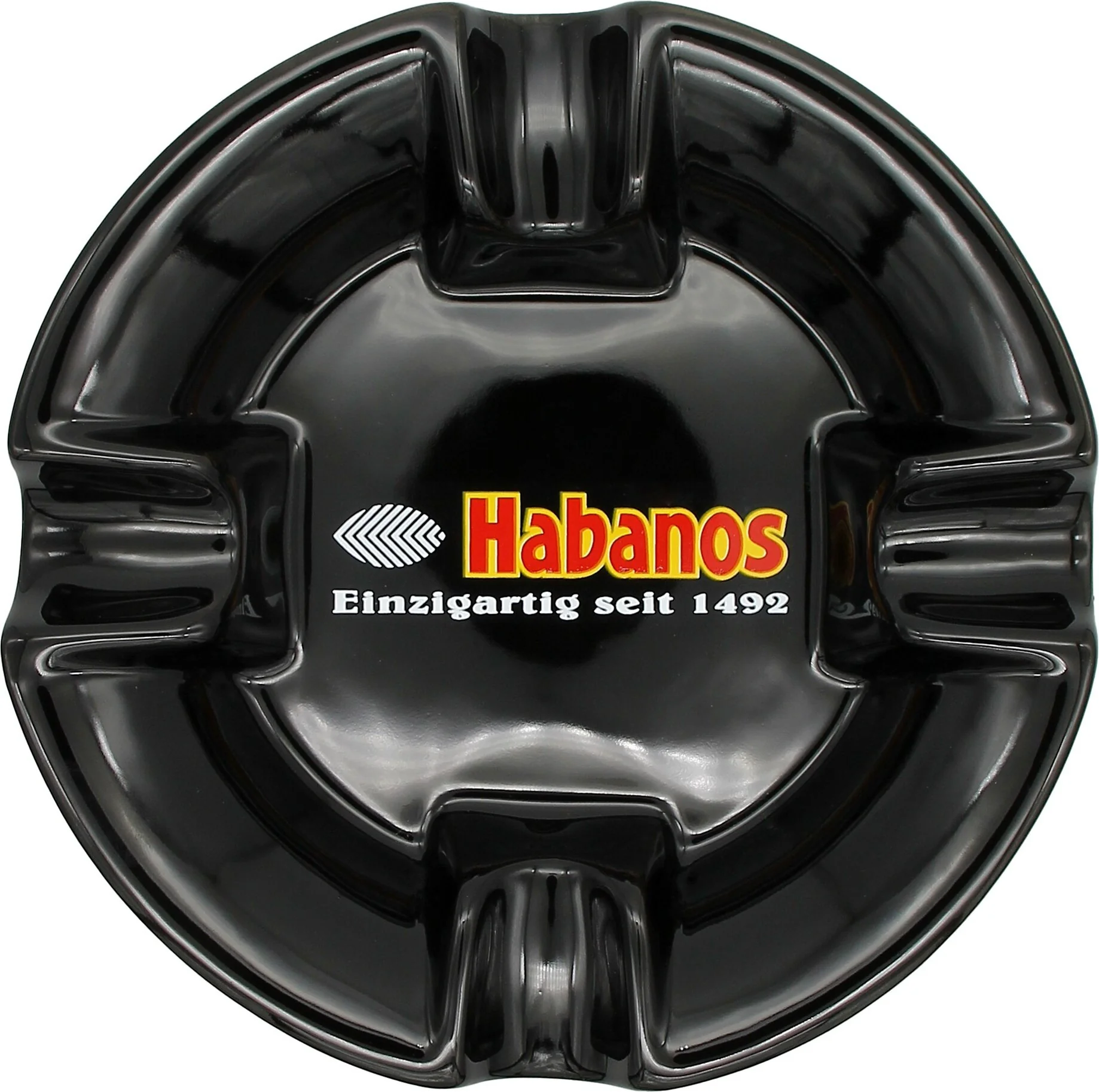 This round porcelain ashtray from Habanos impresses with its understated black design and the German inscription "Unique since 1492", which refers to the founding year of Habanos and adorns the ashtray. It is ideal for enjoying cigars in company, as it features four generously sized cigar rests.