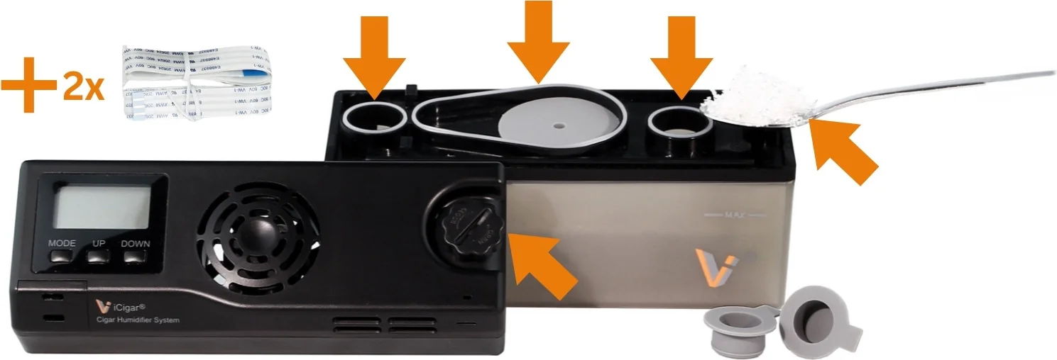 The LV Maintenance Kit is the ideal accessory to ensure the flawless operation and longevity of your LV electronic humidifier. It contains all the essential replacement and wear parts that should be replaced regularly during use to maintain consistently optimal humidity in your humidor.