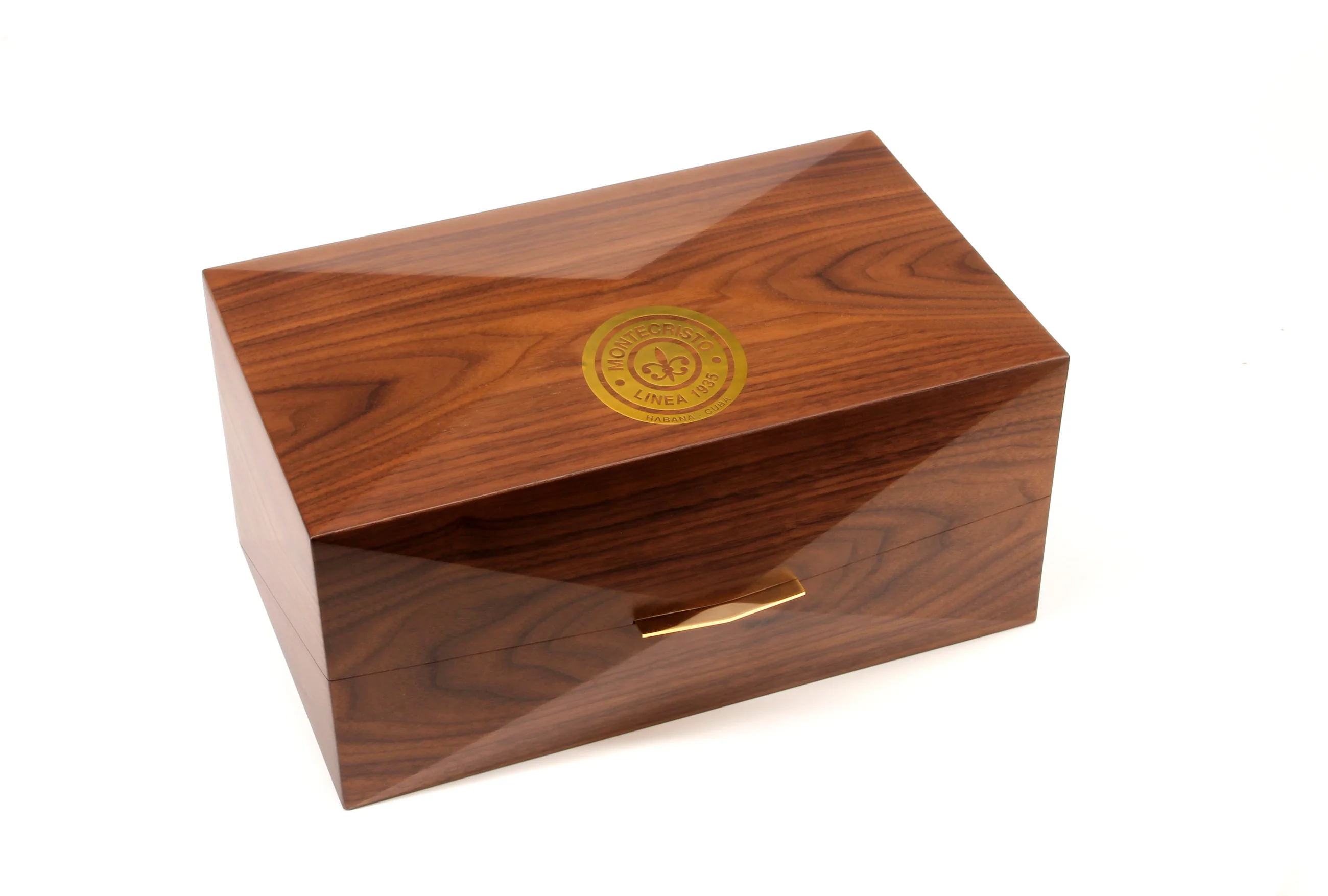 - Humidor med høykvalitet og med utsøkt arbeide i nyanser av brunt med gullbeslag og gylden Montecristo Linea 1935 logo