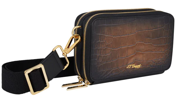 S.T. Dupont Le Grand Atelier Cigar Crossbody Bag Havanna er et stilig tilbehør for sigarrøykere. Denne lille skuldervesken er laget av kalveskinn med krokodillemønster og er en elegant og praktisk løsning for transport av sigarer og tilbehør. Vesken er ideell til å bære et 3 sigars-etui fra S.T. Dupont sammen med tilhørende tilbehør .