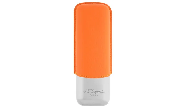 S.T. Dupont sigaretui for 2 sigarer i oransje med krom er et elegant og moderne etui fra det franske luksusmerket S.T. Dupont. Den øvre delen er laget av høykvalitets kuskinn i oransje, bearbeidet i Spania, med innpregingen "Made in Spain" på innsiden. Skinnet har en dekorativ søm på utsiden som understreker det sofistikerte helhetsinntrykket. Den nedre delen er laget av skinnende krom og gir optimal beskyttelse ved transport, da den er trykk- og bruddsikker. En spesiell detalj er hakket i øvre del av metallbasen, som forhindrer at sigarene – eller én enkelt sigar – ruller frem og tilbake i etuiet. Diameteren på etuiet i rustfritt stål er 2,45 cm og rommer dermed to sigarer med maks ring gauge 61. Lengden er justerbar fra ca. 160 mm til ca. 220 mm. Produktet leveres i en representativ gaveeske, noe som gjør det ideelt som gave. Gled en selvsikker og sporty entusiast med denne trofaste følgesvennen. Garantikort og vedlikeholdsanvisning fra Dupont følger med.