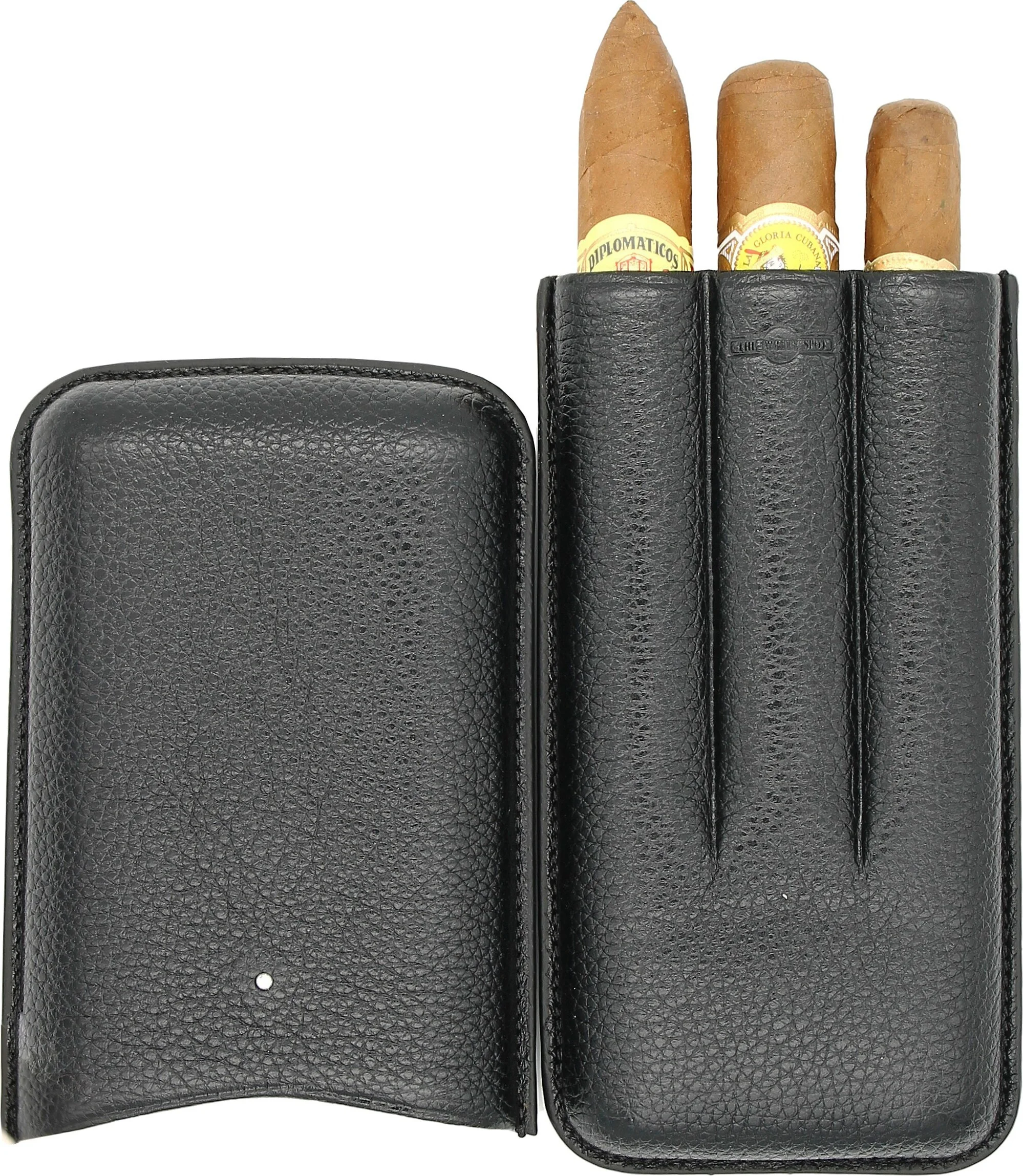 Inside, the case offers space for three cigars of different sizes. Practical notches ensure secure hold during transport. The interior is lined with soft leather and reliably protects the cigars.