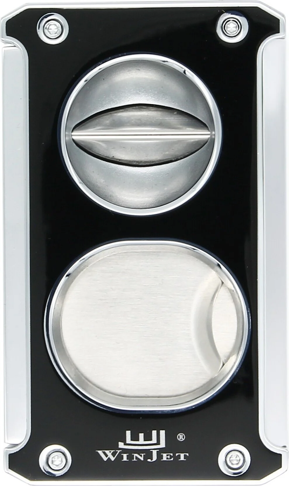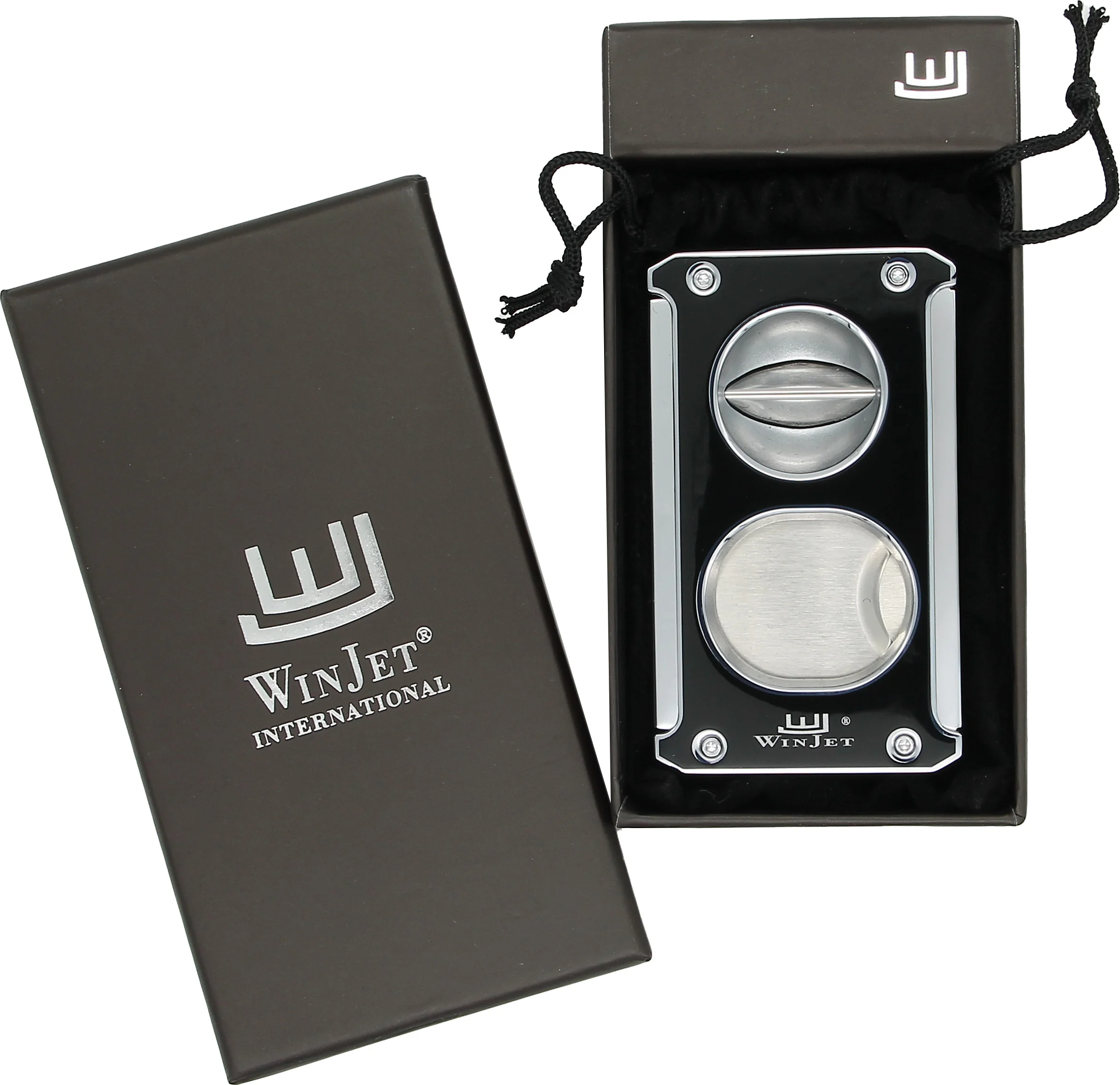 Forbedre sigaropplevelsen med Winjet 3-i-1 sigarkutter i skinnende svart med sølvfargede detaljer. Dette allsidige tilbehøret er tilpasset sigarentusiasters ulike preferanser, og kombinerer et klassisk kutt, et V-kutt og en sigarstans i ett og samme verktøy.